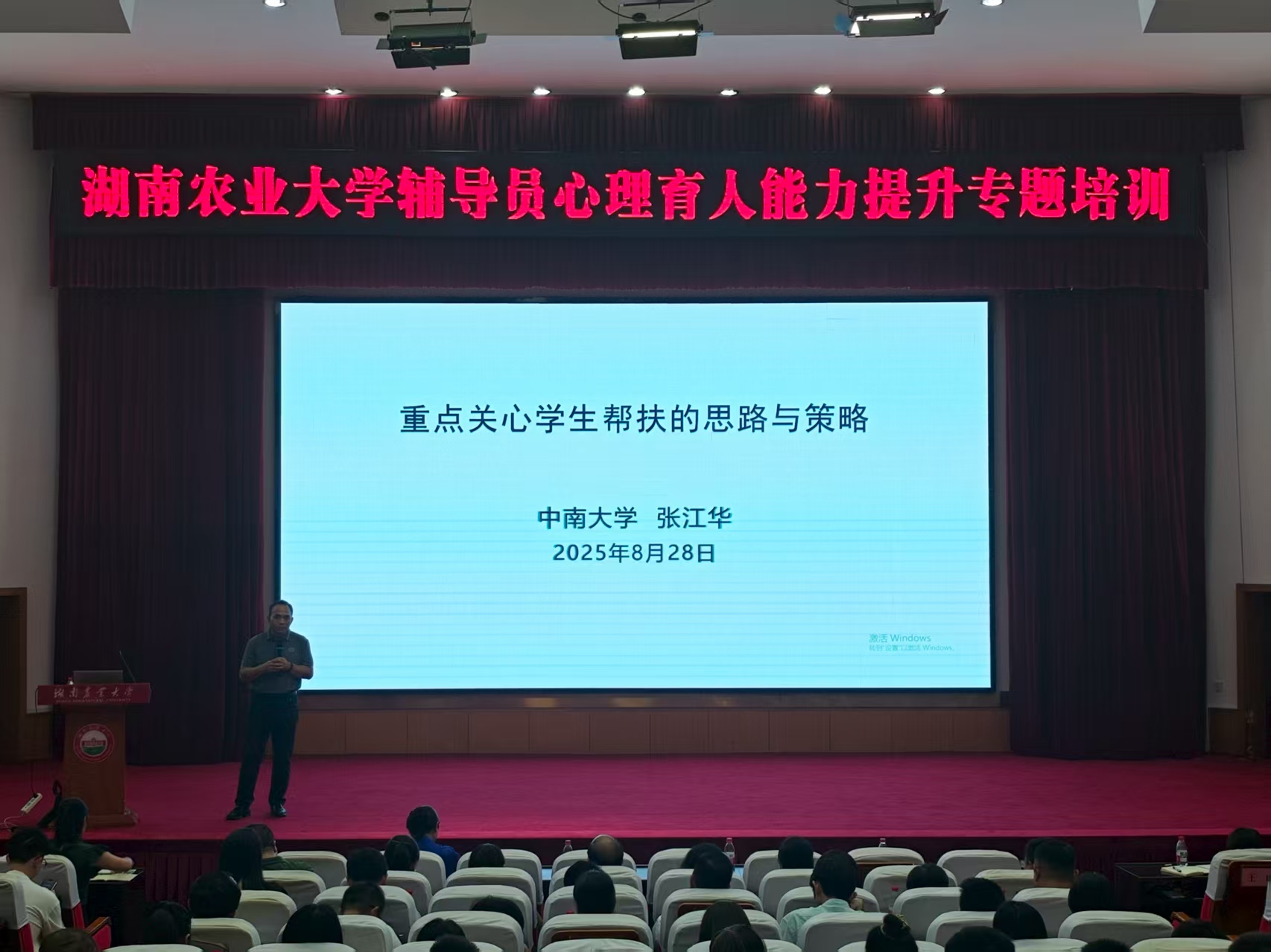 8月28日,学校在修业讲堂举办“辅导员心理育人能力提升专题培训”。此次培训特邀中南大学学生工作部副部长、心理中心主任张江华主讲,我校学生工作部副部长朱佳主持,全体辅导员及心理健康教育专职教师参加。
